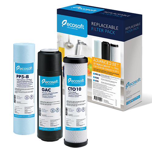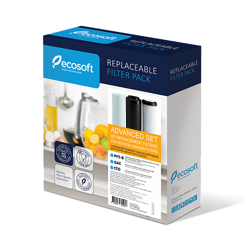 Setul include trei cartuse Ecosoft, care sunt necesare pentru prefiltrarea apei in fata membranei intr-un filtru casnic cu tehnologie osmoza inversa. Setul imbunatatit include doua cartuse din carbon, deci este potrivit pentru apa cu un continut ridicat de clor.